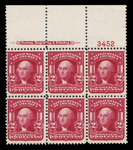 721 nhPB 319 image#319, 2c Carmine, choice full top sheet-margin imprint and plate no. 3452 block of six, brilliantly fresh, with strikingly intense color, well centered, o.g., n.h., very fine; 1998 PF certificate. (Image) $175.00