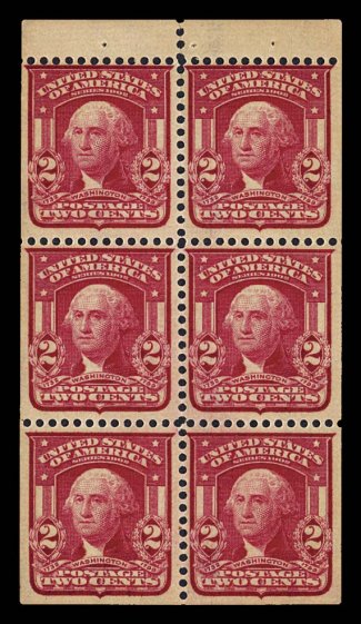 723 nhBP 319q image#319q, 2c Lake, Ty. II, booklet pane, position A, unusually well centered, exceptionally fresh and crisp with deep color, o.g., n.h., very fine example of this scarcer color and particularly desirable so choice. (Image) $575.00