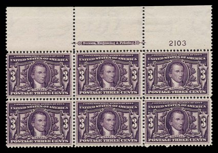 726 nhPB 325 image#325, 3c Louisiana Purchase, full top margin imprint and plate no. 2103 block of six, deeply rich color, o.g., n.h., fresh and fine. (Image) $1,650.00