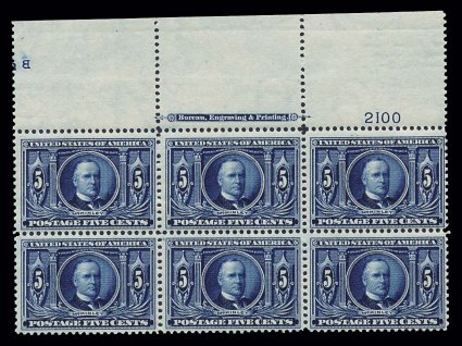 729 ogPB 326 image#326, 5c Louisiana Purchase, full top margin imprint and plate no. 2100 block of six, intense rich color, o.g., lightly hinged, small gum wrinkle at top left, fine-very fine. (Image) $1,000.00