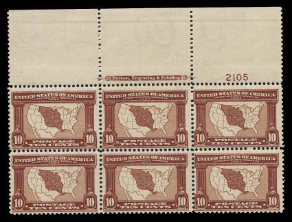 731 nhPB 327 image#327, 10c Louisiana Purchase, full top margin imprint and plate no. 2105 block of six, strong fresh color, o.g., n.h., a couple light fingerprints on gum, minor horizontal crease at far top of selvage, otherwise fine-very fine. (Image) $3,750.00