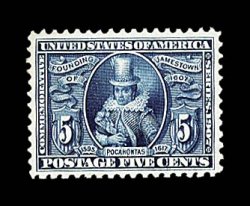 732 og 330 image#330, 5c Jamestown, wonderfully well centered within uncommonly large margins, rich luxuriant color, o.g. with just the faintest possible trace of hinging, extremely fine; accompanied by a 1994 PF certificate when the bottom selvage was still attached (specifically stating "never hinged"), however when the bottom selvage was removed, it apparently also became hinged, as the 2004 PF certificate states "previously hinged at bottom left". (Image) $150.00