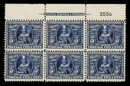 733 ogPB 330 image#330, 5c Jamestown, top margin imprint and plate no. 3554 block of six, strong color, o.g., fine for this scarce plate block. (Image) $2,750.00