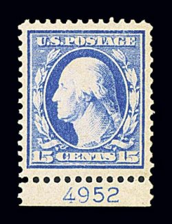 736 og 340 image#340, 15c Pale ultramarine, bottom sheet-margin plate no. 4952 single, extraordinarily well centered within much larger margins that usual, bright color, o.g., barest trace of hinging, extremely fine; 1987 PF certificate (never hinged by omission) and a 2004 PF certificate. (Image) $70.00