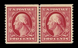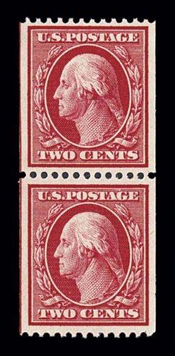 741 nh 349 image#349, 2c Carmine coil, perf. 12 horiz., pair, exceedingly well centered and margined, especially the bottom stamp which is a true gem, wonderfully intense color, o.g., n.h., extremely fine; 2002 PSE certificate. (Image) $400.00