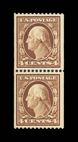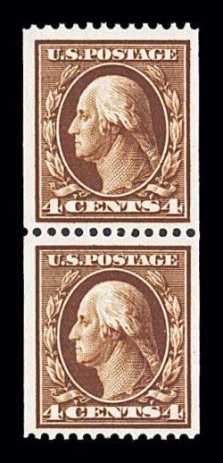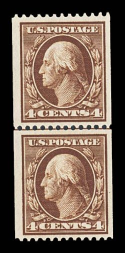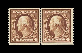 743 og/nh 350 image#350, 4c Orange brown coil, perf. 12 horiz., an exceptionally fresh mint pair, sumptuously rich color and a crisp detailed impression on pristine white paper, well centered within particularly large margins, o.g., top stamp with a faint trace of hinging, bottom stamp n.h., extremely fine; 1993 PF certificate (never hinged by omission). (Image) $510.00+