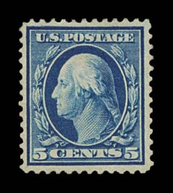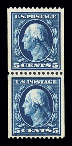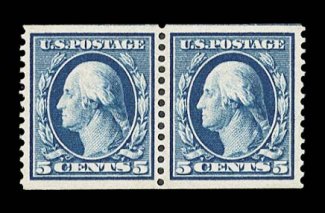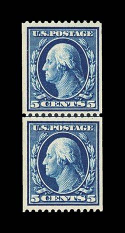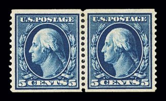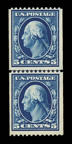 751 og 355 image#355, 5c Blue coil, perf. 12 vert., pair, exceptionally well centered within large margins, strong rich color, o.g., left stamp with faint trace of a thin speck in bottom margin, otherwise extremely fine; clear 1994 PSE certificate. (Image) $575.00