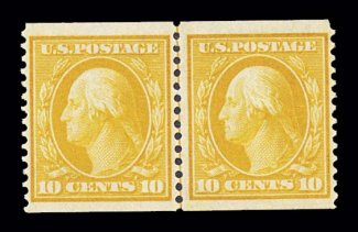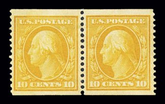 752 og 356 image#356, 10c Yellow coil, perf. 12 vert., an outstanding mint pair of this rare coil, being remarkably well centered within much larger margins than normally associated with this difficult stamp, bright fresh color, o.g., lightly hinged, extremely fine; an especially challenging coil to find in this premium condition; 1981 and 2000 PF certificates. (Image) $6,750.00