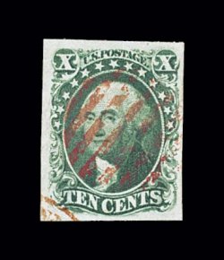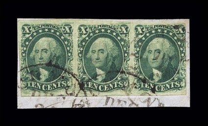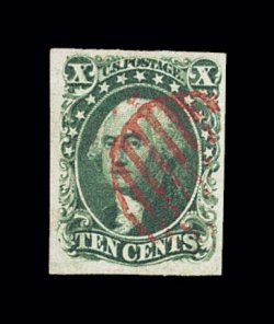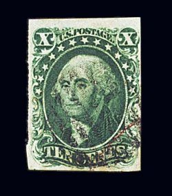 62 O 13 image#13, 10c Green, Ty. I, an extraordinarily choice used single, featuring four extra-large to huge even margins, intensely rich color and a razor-sharp impression, clean and attractive portion of New York exchange office c.d.s., extremely fine; an especially handsome example; 2002 PF certificate. (Image) $800.00