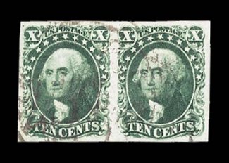 69 O 14 image#14, 10c Green, Ty. II, used horizontal pair, large even margins all around, deep intense color and impression on fresh paper, lightly cancelled, extremely fine and handsome; 1974 and 1999 PF certificates. (Image) $450.00