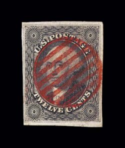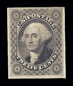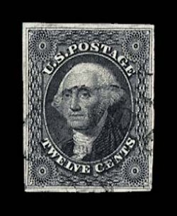 78 O 17 image#17, 12c Black, an incredible quality used example of this difficult imperforate classic, featuring large to huge margins all around which are most uncharacteristic of this, but just as impressive is the stamp's spectacularly intense "jet" black color and prooflike impression, plus its striking central red grid cancel, extremely fine; a lovely stamp with great eye appeal; 1999 PF certificate. (Image) $345.00