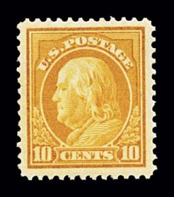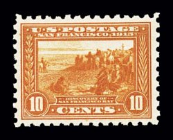 803 nh 404 image#404, 10c Panama-Pacific, perf. 10, a pristine "post office" fresh mint example of this popular and scarce commemorative, possessing an outstanding overall brilliance, with incredibly intense color and impression on bright white paper, wonderfully well centered within large margins, uniformly long and intact perforations, unblemished o.g., without a single gum bend or skip, n.h., extremely fine; 1998 PSE certificate; ex-Lyons. (Image) $1,900.00