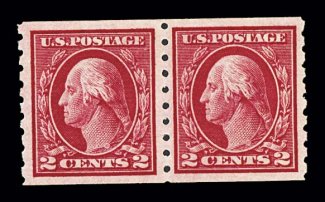 804 nh 413 image#413, 2c Carmine coil, Ty. I, perf. 8 1/2 vert., mint pair, very well centered and margined, especially the left stamp which is a true gem, radiant rich color, o.g., n.h., extremely fine; 1995 PF certificate. (Image) $210.00