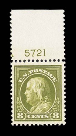 806 nh 414 image#414, 8c Pale olive green, top margin plate no. 5721 single, sumptuously rich color and a vivid impression on fresh paper, well centered within very large margins, pristine o.g., n.h., extremely fine; 2003 PSE certificate. (Image) $100.00