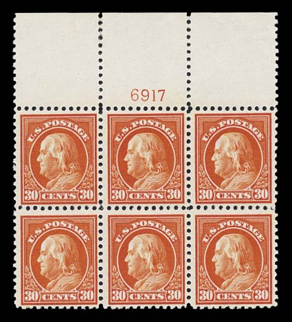 881 nhPB 516 image#516, 30c Orange red, full top margin plate no. 6917 block of six, exceptionally bright and fresh, o.g., n.h., a few trivial reinforced perfs. at top, fine-very fine. (Image) $925.00