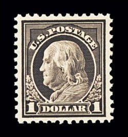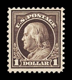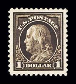 885 og 518b image#518b, $1.00 Deep brown, a most remarkable mint example of this very rare and often misidentified shade, being in a condition that is the exact opposite of what one normally encounters, as the vast majority are either poorly centered or with faults (or both), this example, however, possesses enormously large margins all around and is incredibly well centered within these vast borders, especially fresh and true deep brown color (actually the shade identification in the Scott catalog is a misnomer, as examples of this stamp must display hues of yellow throughout the design in order be correctly identified as a #518b), immaculate white paper, full o.g., lightly hinged, extremely fine; this surely must rank as one of the finest quality mint #518b's available, in addition to being the largest margined example we have ever seen; 1978 PF certificate. (Image) $1,800.00