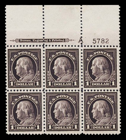 884 nhPB 518 image#518, $1.00 Violet brown, full top margin imprint, letter "A" and plate no. 5782 block of six, nicely centered, strong rich color, fresh and crisp, o.g., n.h., very fine; an impressive example of this very scarce high value plate block. (Image) $2,100.00