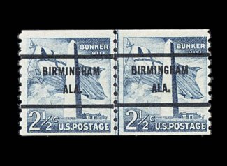 926 og 1056 var. image#1056 var., 2 1/2c Gray blue coil, small holes, a very rare mint joint line pair, with Birmingham, Ala. precancel, full o.g., lightly hinged and with a pencil number erasure on the gum, fine-very fine centering; all of the small hole varieties come from the second printing and all were precancelled; the exceptional rarity of mint examples with full gum, and particularly joint line pairs, is due to the fact that mint precancelled stamps were only available to permit holders for their use, resale of them was illegal, thus nearly all of this perforation variety that are in the market place are used and without gum, and even those are very scarce, thus there are practically no mint examples available; line pairs, being a tiny fraction of this already miniscule number, are great rarities, this being the first example we have ever offered; 1995 APS certificate. (Image) $3,000.00
