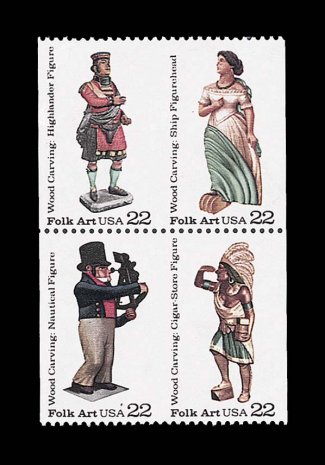 932 nhbl 2243b image#2243b, 22c Wood Carving se-tenant block of four, imperforate vertically, bright and fresh, o.g., n.h., very fine; only 20 blocks have been recorded. (Image) $1,250.00