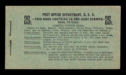 934 BK BK10 image#BK10, 1907 25c Black on green complete unexploded booklet of four panes of 1c Blue green (#300b), position A, most are well margined with variable internal centering, fresh o.g., n.h., attractive and clean covers with only the slightest wrinkle on front cover from opening and hardly any staining from staples, very fine; a terribly difficult booklet to find yet intact (Furman #BK10 BC2A Im) (Image) $6,500.00