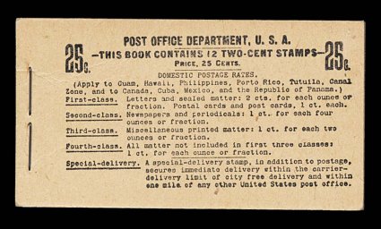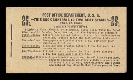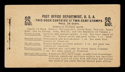 935 BK BK14 image#BK14, 1903 25c Black on cream complete unexploded booklet of two panes of 2c Carmine, Ty. I (#319g), position A, fresh with fine-very fine centering, o.g., n.h., covers are unusually clean and crisp with no stains around staples, very fine and attractive early booklet (Furman #BK14 BC2B Im). (Image) $1,000.00
