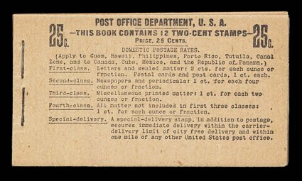 937 BK BK14 image#BK14, 1903 25c Black on cream complete unexploded booklet of two panes of 2c Lake, Ty. II (#319q), position A, both panes quite well centered being fresh with light natural flat plate gum bends, o.g., n.h., covers are particularly nice with fresh color, especially crisp and clean, very fine and choice; neither Scott nor Furman assign different booklet numbers for the different colors and types that these panes come in and the generic catalog value is for the most common pane varieties, this 2c Lake, Ty. II is far rarer than the 2c Carmine Ty. I and especially so in such a select example (Furman #BK14 BC2B Il). (Image) $1,000.00+