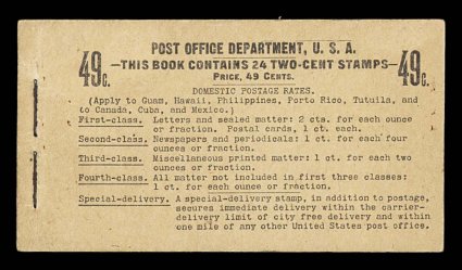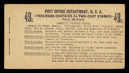 940 BK BK15 image#BK15, 1903 49c Black on cream unexploded booklet of four panes of 2c Carmine, Ty. I (#319g), position A, panes with fine centering trimmed slightly in at bottom, o.g., n.h., exceptionally fresh and clean covers, very fine (Furman #BK15 BC2A Il). (Image) $1,250.00
