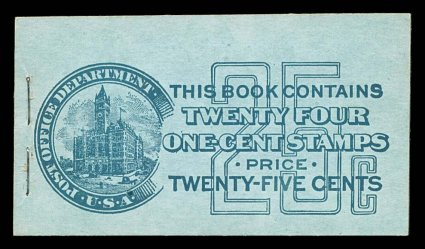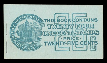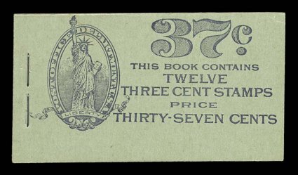 961 BK BK47 image#BK47, 1916 25c Green on green complete booklet of four panes of 1c Green (#462a), position J, panes are fresh with fine centering, o.g., n.h., covers are attractive and clean, minor wrinkle on front cover, very fine; though the position of these panes is in theory not that scarce, it is much more elusive than one would expect because these issues were frequently trimmed close at bottom removing the line (Furman #BK47 BC4A IIg). (Image) $650.00