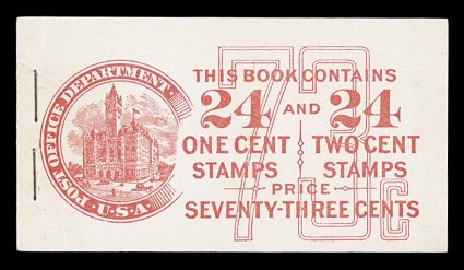 962 BK BK49 image#BK49, 1916 73c Red on white complete unexploded booklet, consisting of a combination of four panes each of 1c Green and 2c Carmine (#462a, 463a), position A, panes with rich colors, fine-very fine centering internally, trimmed close or just in at bottom of panes, o.g., n.h., covers are clean and fresh with light opening wrinkles along the staples, very fine (Furman #BK49 BC4 IIe). (Image) $900.00