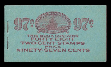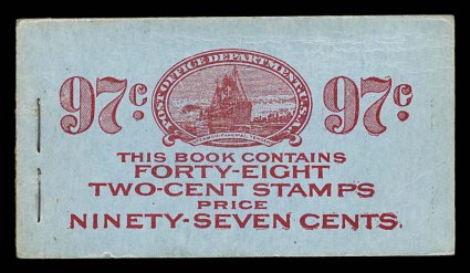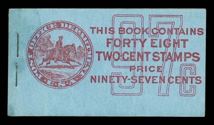 963 BK BK52 image#BK52, 1916 97c Red on blue complete unexploded booklet of eight panes of 2c Carmine (#463a), position A, panes with lovely pastel color, overall quite well centered with several exceptionally well centered, o.g., n.h., covers are clean and crisp, minor opening wrinkles on front cover along the staples, quite typical of this size booklet, very fine and scarce booklet (Furman #BK52 BC5A IIg). (Image) $2,250.00