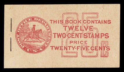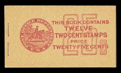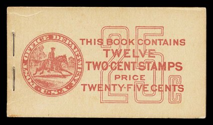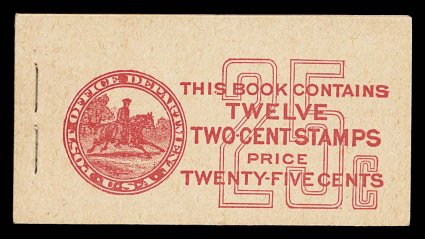 965 BK BK58 var. image#BK58 var., 1917 25c Red on buff complete unexploded booklet of two panes of 2c Rose (#499e), position I, panes are exceptional fresh with deep color, reasonably well centered, o.g., n.h., covers are pristine, very fine and choice; this booklet has a rare Furman cover type IIi that is valued at nearly double the normal (Furman #BK58 BC5A IIi). (Image) $250.00+