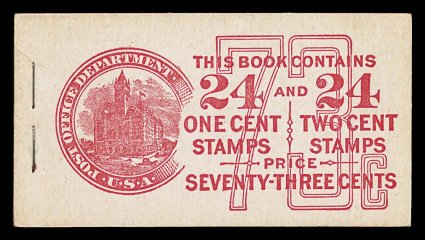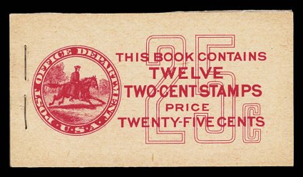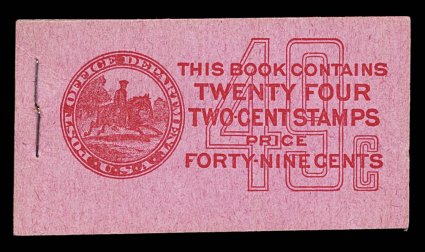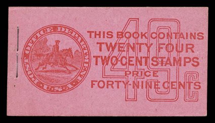 967 BK BK59 var. image#BK59 var., 1917 49c Red on pink complete unexploded booklet of four panes of 2c Rose (#499e), position A, panes are well centered with fresh color, o.g., n.h., unusually crisp clean covers, only light staple indentation on front at right from another booklet from Post Office packaging, extremely fine; this booklet has scarcer Furman cover type IIg that receives considerable premium over the normal (Furman #BK59 BC5A IIg). (Image) $400.00+