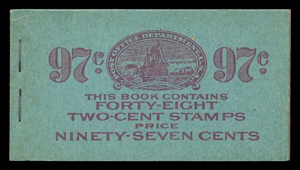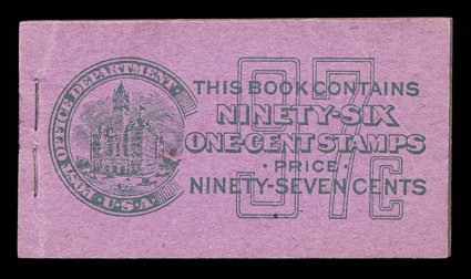 976 BK BK76 image#BK76, 1927 97c Green on lavender complete unexploded booklet of sixteen panes of 1c Green (#632a), panes are all fresh and overall well centered, o.g., n.h., covers have bright colors, light opening creases at left on front cover, quite typical on these large booklets, otherwise very fine (Furman #BK76 BC4A IVb). (Image) $600.00