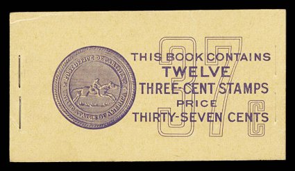 979 BK BK84a image#BK84a, 1932 37c Violet on buff complete unexploded experimental booklet, with cellophane interleaving, consisting of two panes of 3c Deep violet (#720b), panes are fresh with strong color, well centered internally but trimmed tight along the left edge of the panes, o.g., n.h., covers are pristine, light staple indentations at right of front cover from Post Office packaging, very fine and choice; this is a further experiment with cellophane using a lighter gauge than that of #BK80a, extra cost and difficulty of handling resulted in the abandonment of the project, as before these booklets are a great rarities because very few were saved (Furman #BK84 BC9A Vd). (Image) $1,750.00