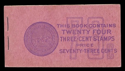 971 BK BK68 var. image#BK68 var., 1923 73c Red on white complete unexploded booklet, consisting of the combination of four panes each of 1c Deep green and 2c Carmine (#552a, 554c), position H, overall quite well centered, o.g., n.h., covers are crisp and clean, very fine and choice; Furman lists three different cover types, one common and the other two scarce to very scarce, this is type IVa and the rarest of the three (Furman #BK68 BC4B IVa). (Image) Est. 200-300