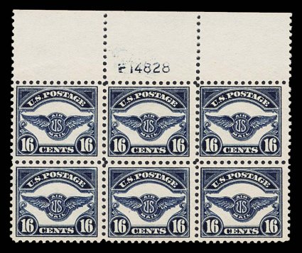 1005 ogPB C5 image#C5, 16c Dark blue, full top margin plate no. F14828 block of six, deep intense color and impression, o.g., lightly hinged on the top middle stamp, other five stamps n.h., fine-very fine. (Image) $1,550.00