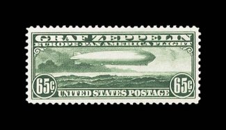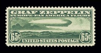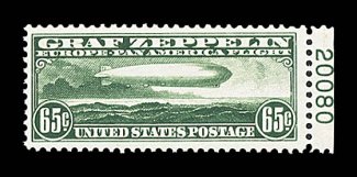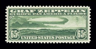 1013 nh C13 image#C13, 65c Graf Zeppelin, extraordinarily well centered within very large margins, wonderfully bright and crisp, unblemished o.g., n.h., extremely fine; an especially handsome stamp. (Image) $350.00
