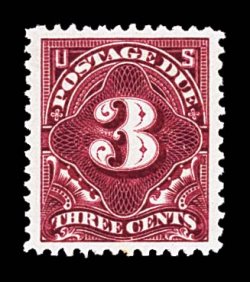 1063 nh J33 image#J33, 3c Deep claret, an incomparable quality mint example of this scarce and surprisingly difficult postage due to find in premium condition, fabulously fresh and crisp, with gloriously rich color and a deeply etched impression, marvelously well centered within huge margins for this normally small margined and often poorly centered stamp, unblemished o.g., n.h., extremely fine; certainly among the very finest examples available which renders its modest catalog totally meaningless; 2004 PF certificate. (Image) $425.00