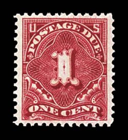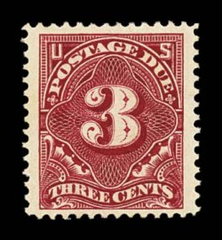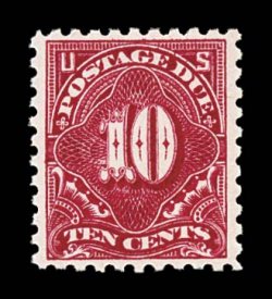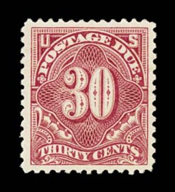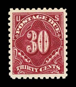 1080 nh J57 image#J57, 30c Carmine lake, a fabulously well centered mint single, with exceptionally large margins which are most uncharacteristic of the perf. 10 postage dues, intense radiant color and prooflike impression on bright paper, o.g., n.h., extremely fine; an especially scarce stamp in this gem quality. (Image) $480.00