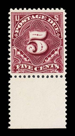 1068 nh J41 image#J41, 5c Deep claret, pristine bottom sheet-margin mint single, intense color and a razor-sharp impression on immaculate paper, exceptionally well centered, o.g., n.h., extremely fine; 2004 PF certificate. (Image) $160.00