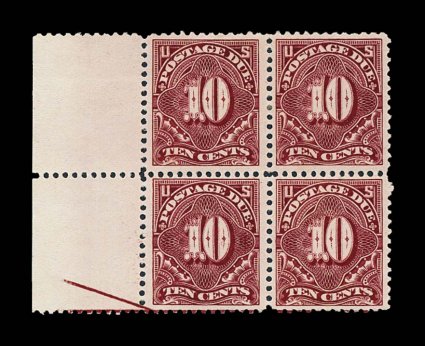 1069 og/nhbl J42 image#J42, 10c Deep claret, left sheet-margin block of four, with partial arrow and guide line at bottom, exceptionally fresh, with deep rich color and a sharp detailed impression on bright white paper, well centered, o.g., bottom right stamp n.h., very fine; 2004 PF certificate. (Image) $385.00+