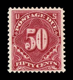 1075 nh J50 image#J50, 50c Deep claret, pristine mint single, rich vibrant color and a sharp impression, attractively centered, o.g., never hinged, very fine; an extremely difficult stamp to find never hinged; photocopy of a 1985 PF certificate for a block of four, this being the bottom left stamp. (Image) $2,500.00