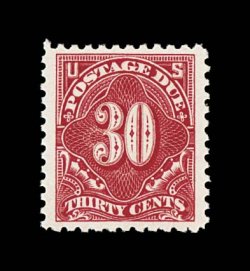 1081 nh J57 image#J57, 30c Carmine lake, an exceedingly choice mint example, featuring outstanding centering amid extraordinarily large margins for a perf. 10 postage due stamp, beautiful vibrant color and a sharp impression on brilliantly fresh paper, o.g., never hinged, extremely fine; 1998 PF certificate. (Image) $500.00