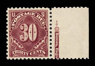 1085 nh J66a image#J66a, 30c Deep claret, right sheet-margin partial imprint single, uncharacteristically well centered, strong rich color and impression, immaculate o.g., n.h., extremely fine; 1995 PF certificate. (Image) $175.00