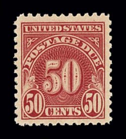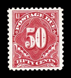 1082 O J58 image#J58, 50c Carmine lake, a rarely seen sound used example of this terribly elusive and difficult postage due, being among the few examples that is both completely sound and not either pen cancelled or precancelled, wonderfully fresh, intensely rich color and a crisp impression on bright paper, quite well centered, very light and unobtrusive c.d.s. postmark, overall very fine; 2004 PF certificate. (Image) $1,200.00