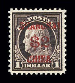 1094 O K15 image#K15, $1.00 on 50c Light violet, used, particularly well centered within large margins, attractive pastel color, lightly cancelled by portion of non-Shanghai flag cancel, choice very fine; the very rare flag cancel of Shanghai was used ten or more years before the surcharged values were issued and has narrower stripes, but any used example of this high value is scarce; 2001 PF certificate. (Image) $650.00