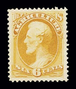 1097 og O4 image#O4, 6c Agriculture, a most impressive mint example, featuring lavishly large and wonderfully well balanced margins all around, gorgeous vivid color in a deep shade, unusually clean full o.g., l.h., an extremely fine jumbo; 1999 PF certificate. (Image) $140.00