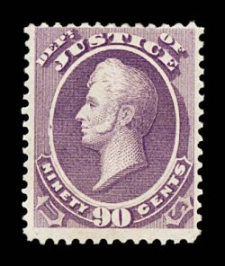 1101 og O34 image#O34, 90c Justice, fresh mint single, bright color, full o.g., lightly hinged, fine and scarce stamp; 1992 PF certificate. (Image) $1,350.00