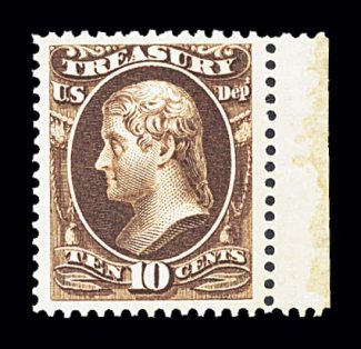 1103 nh O77 image#O77, 10c Treasury, a phenomenal right sheet-margin mint single, possessing physical attributes rarely found on any of the officials, including being mathematically centered within especially wide margins which are most uncharacteristic, prooflike color and impression on immaculate paper, full clean o.g. that is never hinged, in all an extremely fine gem in every respect; a stamp that is sure to please the most condition conscious collector; 2004 PF certificate for a vertical pair, this being the bottom stamp. (Image) for hinged $100.00+