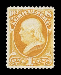 1104 og O94 image#O94, 1c Agriculture, on soft porous paper, without gum as issued, an especially choice example of a stamp that is not only rare but is extraordinarily challenging to find fault free, brilliantly fresh, with absolutely radiant color on bright paper, well centered, choice very fine; 1981 PF certificate. (Image) $4,250.00